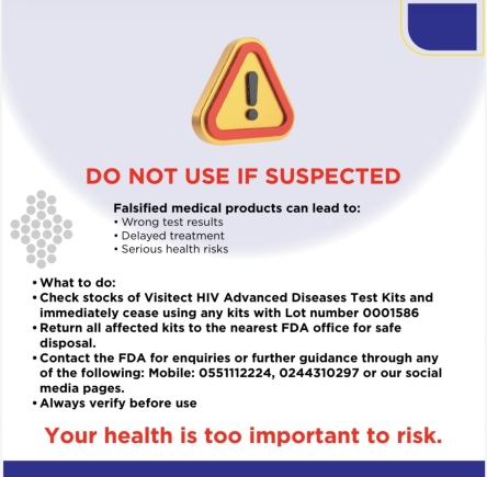 Affected kits are to be returned to the nearest FDA office for safe disposal. The authority has also encouraged healthcare providers and members of the public to contact the FDA directly on 0551112224 or 0244310297 for further guidance or to report suspected falsified products.